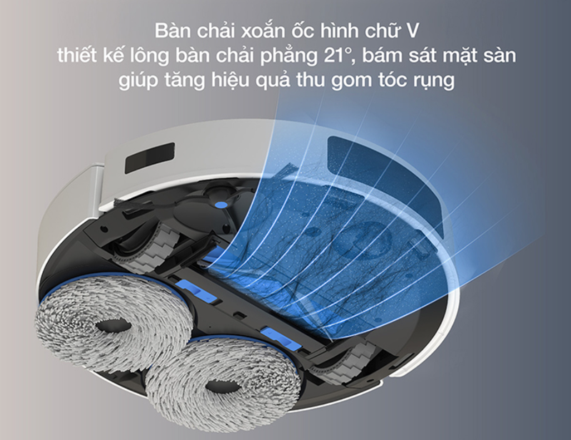 - Bước 1: Bàn chải răng xoắn ốc hình chữ V cải tiến với lông bàn chải chống tĩnh điện và góc phẳng 21°, bàn chải này bám sát mặt sàn, giúp thu gom và giữ tóc hiệu quả mà không làm tóc vướng vào bàn chải.